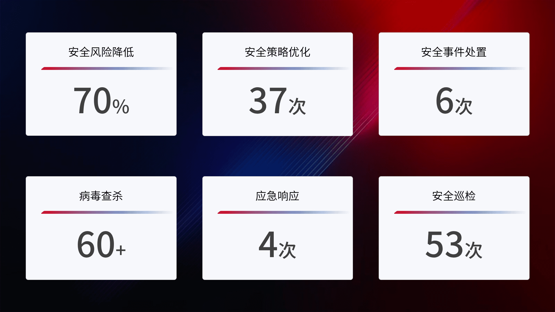 提供全面的安全事件报告体系,,,包括处置报告、、、周报、、季度和年度总结,,,结合持续监控,,,,帮助客户深入了解网络安全状况。。。。