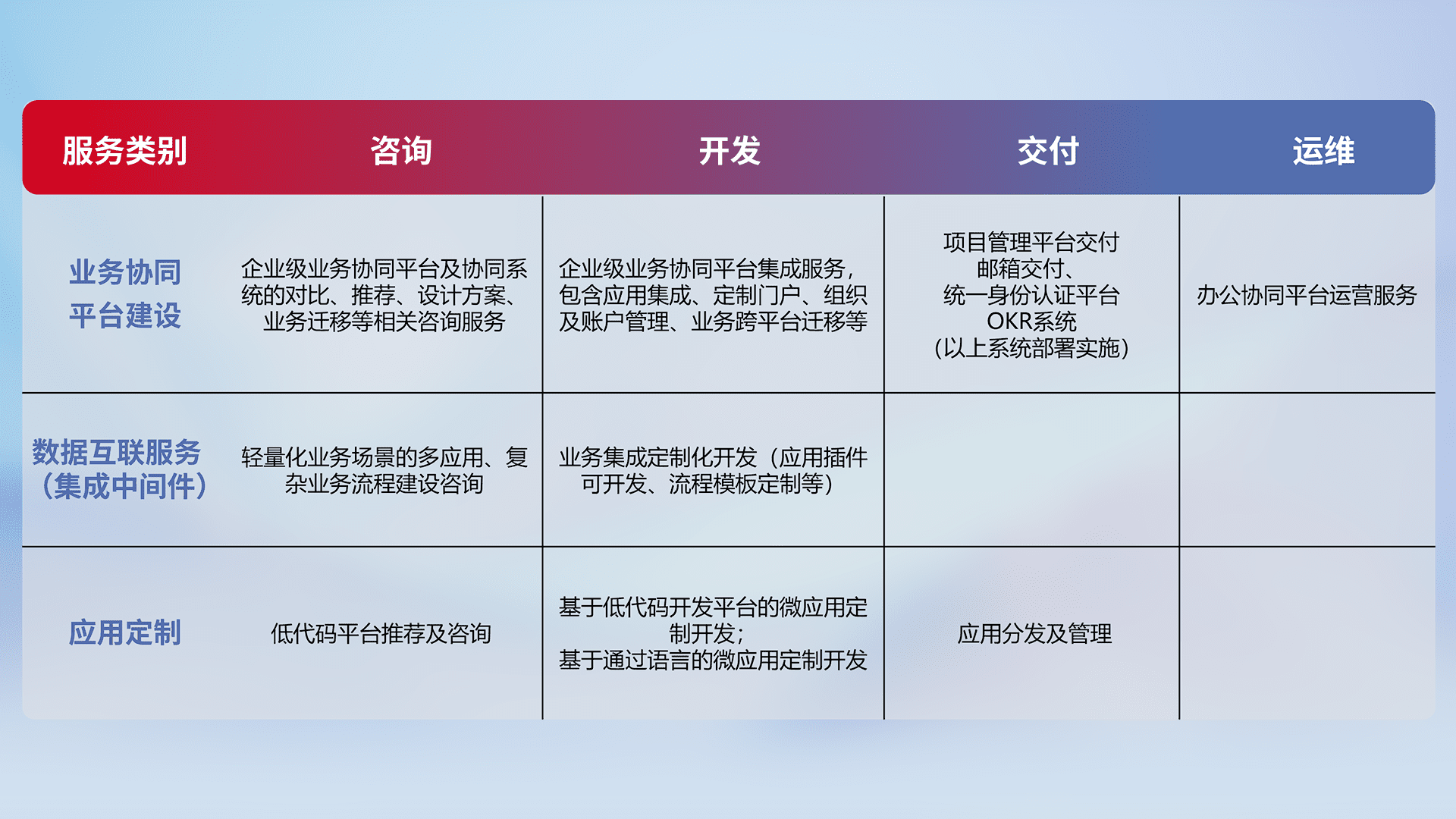 针对钉钉、、企微、、、IDaas等平台级产品提供产品的规划、、、方案、、、交付、、、定制化开发等服务,,实现如统一协同办公、、、智能客户服务、、混合会议管理、、、智能数据查询、、、等业务场景,,,,实现数字化转型。。